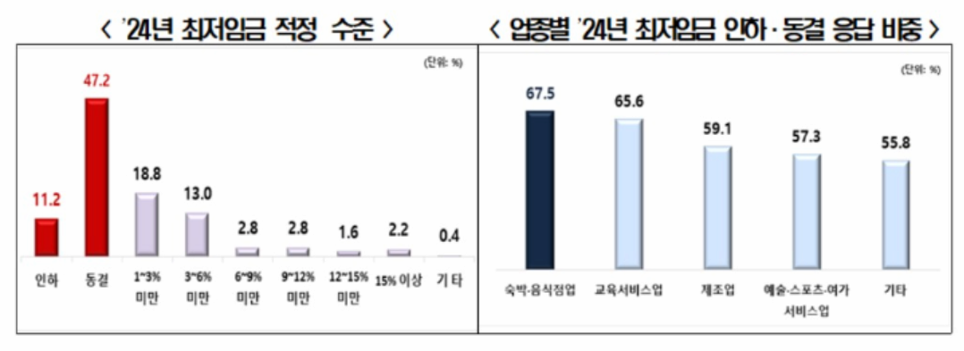 최근 전국경제인연합회는 지난 5월 2~8일 자영업자 500명을 설문 조사한 결과 58.4%가 내년도 최저임금을 동결(47.2%)하거나 인하(11.2%)해야 한다고 답하였습니다. 임금을 1~9% 인상해야 한다는 답변도 34.6%를 차지하였으며 2024 최저임금 인상을 놓고 노동계와 경영계 갈등이 있는 가운데 자영업자 10명 중 6명이 동결 혹은 인하를 원하는 것으로 나타났습니다. 이번 조사는 소비 부진으로 고생하는 자영업자들이 현재 수준의 임금도 감당하기 어렵다고 느끼고 있고 최근 소비 부진으로 힘든 업종인 음식점업(67.5%), 교육서비스업(65.6%)에서 동결 및 인하가 필요하다고 응답하였습니다.