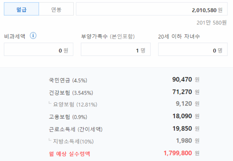 올해 월급 실수령액은 위와 같이 4대 보험 소득세를 공제하고 세후 1,799,800원이 됩니다.