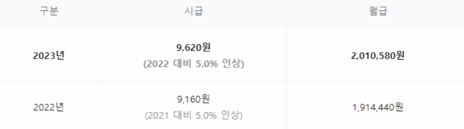 2022 최저임금 9,160원이고 올해는 9,620원으로 지난해 대비 5% 인상되었습니다. 월급으로 환산 시 209시간(주 5일 근무제의 월 근로 시간)을 곱하여 산정하게 되어 세전 월급 실수령액은 2022년도에는 1,914,440원, 올해는 2,010,580원이 되며 노동계에서 요구하는 금액 12,000원 적용 시 월급은 2,508,000원이 됩니다.
