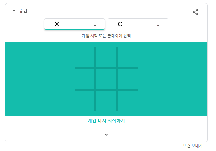 두명이 번갈아가며 O와 X를 3X3 판에 써서 같은 모양이 가로, 세로, 대각선상에 일치하면 이기는 게임입니다. 빙고과 비슷하며 초급, 중급, 고급, 친구와 대결하기를 통해 난이도를 조절할 수 있습니다.