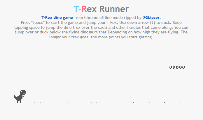 인터넷에 연결이 되지 않았을 때 할 수 있는 게임으로, 구글의 숨겨진 게임중에 가장 대표적인 게임입니다. 인터넷을 연결할 수 없는 상황이거나 기기의 와이파이를 끊고 크롬을 실행하면 인터넷에 연결할 수 없습니다 라는 문구와 함께 공룡 모양의 게임이 나타납니다.