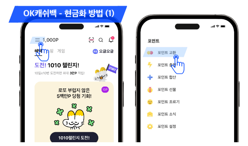 2) OK 캐쉬백 앱에 접속 후 좌측 삼단바를 클릭 한 뒤, 아래로 내려가 포인트 교환을 클릭합니다.