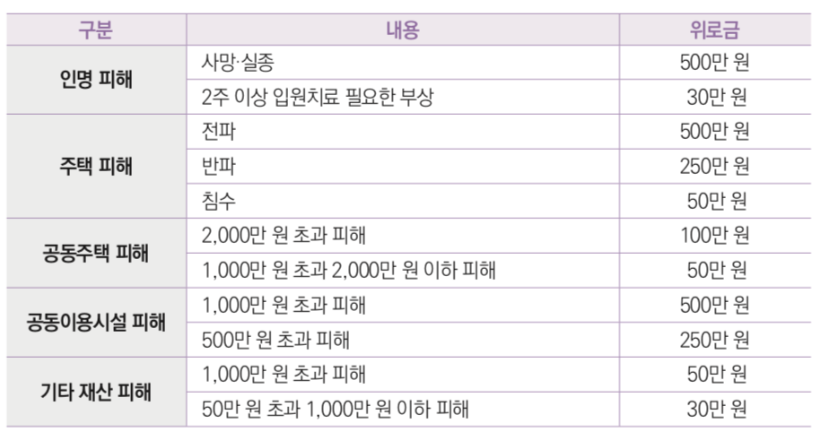 - 태풍, 호우, 지진, 한파, 폭염 등 자연재해나 거주하는 주택의 화재로 인한 피해, 특별재난지역의 피해의 경우 피해 정도에 따라 재해위로금 지급