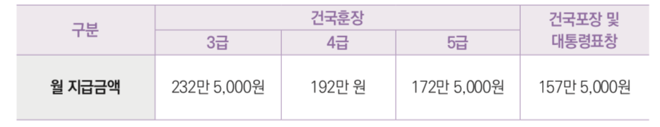 - 훈격에 따라 매월 특별예우금 지급