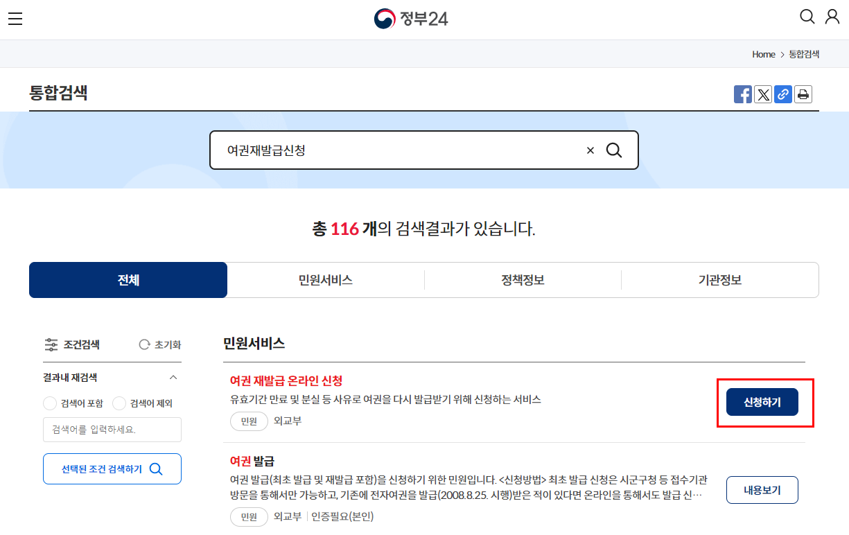 2) 상단의 검색창에서 여권 재발급 신청을 클릭하신 뒤 진행하시면 됩니다. 참고로, 생애 처음으로 여권을 신청하시는 분들과 만 18세 미만의 미성년자의 경우 온라인 신청은 불가하니 참고하시길 바랍니다.