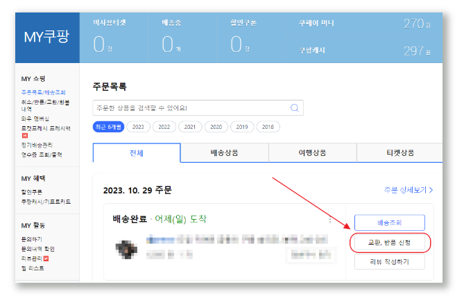 • 모바일: 마이쿠팡 > 취소/반품/교환목록 > 무통장 환불 클릭 > 계좌 등록하기