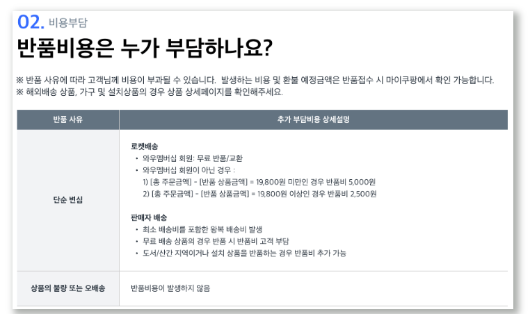 환불 비용도 환불 기간과 마찬가지로 두 가지로 나뉘며, 로켓 와우 회원의 경우 환불 시 비용이 따로 발생하지 않습니다.