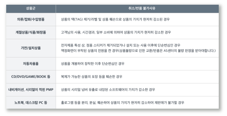 취소 및 반품이 불가한 사유도 당연히 존재하며, 사유는 하단과 같습니다.