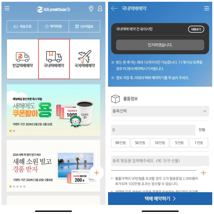 GS25 편의점 택배 앱 혹은 홈페이지에서 먼저 접수를 해야 합니다. 회원 또는 비회원으로 접수가 가능하며 편의점에 가기 전 홈페이지나 앱을 통해 예약을 하고 가시면 쉽게 편의점 택배를 보낼 수 있습니다.