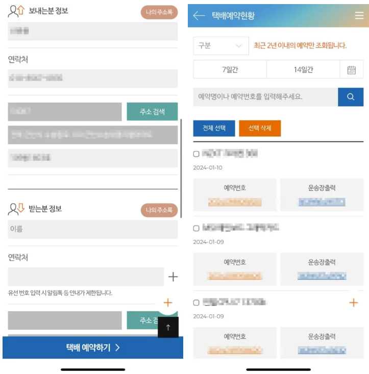 이후 보내는 분 정보, 받는 분 정보, 택배비 선 후불을 선택 후 예약을 합니다. 예약을 한 뒤 예약현황에서 정보를 확인 후 GS25 편의점에 방문합니다.