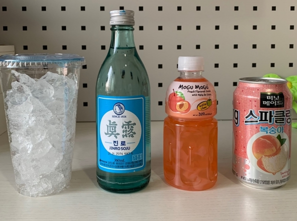 준비물은 모구모구 복숭아 맛, 미닛메이드 스파클링 복숭아, 소주, 얼음입니다. 얼음이 모구모구 속 나타드 코코가 나오는 것을 막기 때문에 나타드 코코를 좋아하시는 분은 스무디용 빨대를 사용하시는것을 추천드리며, 모구모구와 스파클링을 섞었을때는 술 맛이 많이 나기 때문에 소주의 맛과 향이 더 잘 느껴집니다.