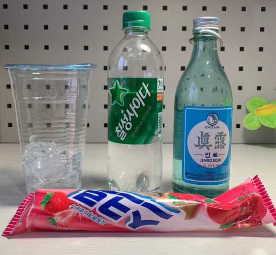 준비물은 스크류바, 사이다, 소주, 얼음입니다. 스크류바주도 메로나주와 마찬가지로 아이스크림을 이용한 칵테일이기 때문에 얼음은 생략하셔도 괜찮습니다. 스크류바주는 스크류바 겉면 색상인 진분홍 색상으로 꽤 예쁘게 만들어지며, 점도가 높지 않고 술 맛이 거의 나지 않아 가벼운 칵테일로 즐기실수 있습니다.
